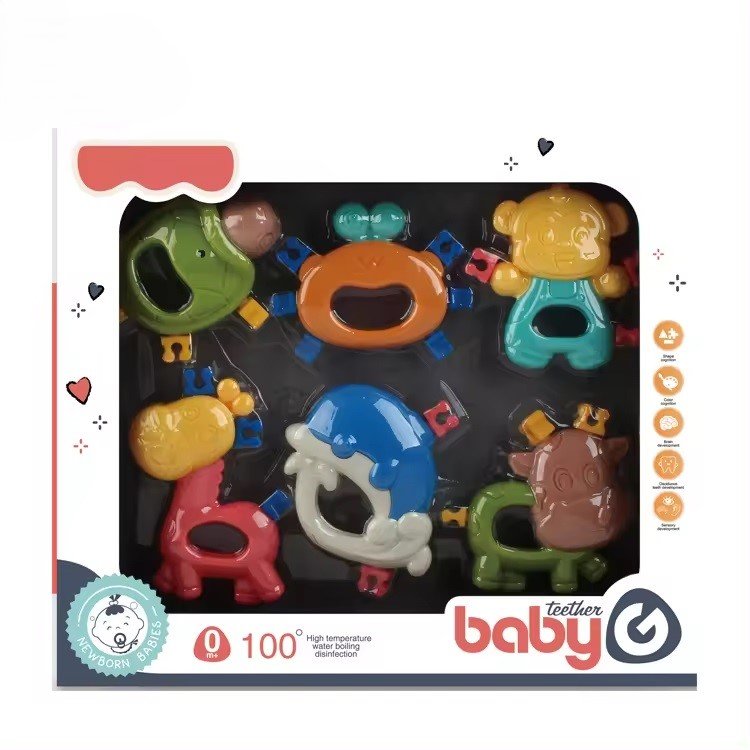 نقدم لكِ مجموعة ألعاب التسنين الملطفة للرضع وهي مجموعة مصممة بعناية مكونة من 6 قطع تهدف إلى تخفيف انزعاج طفلك من التسنين مع تعزيز النمو الحسي.