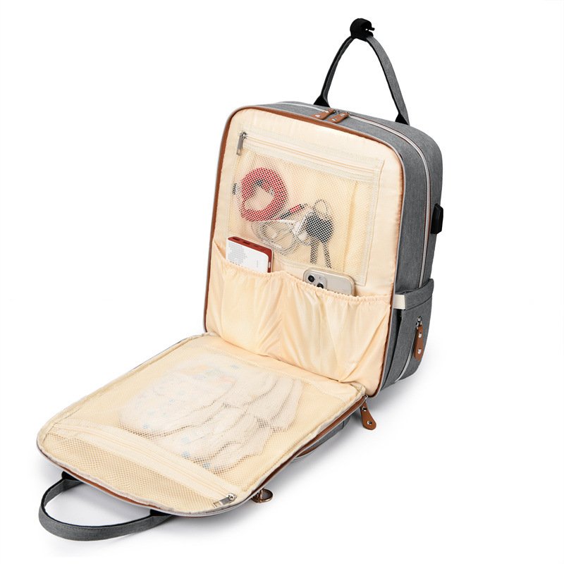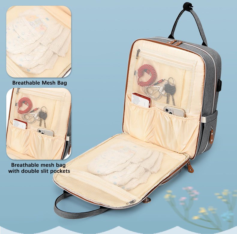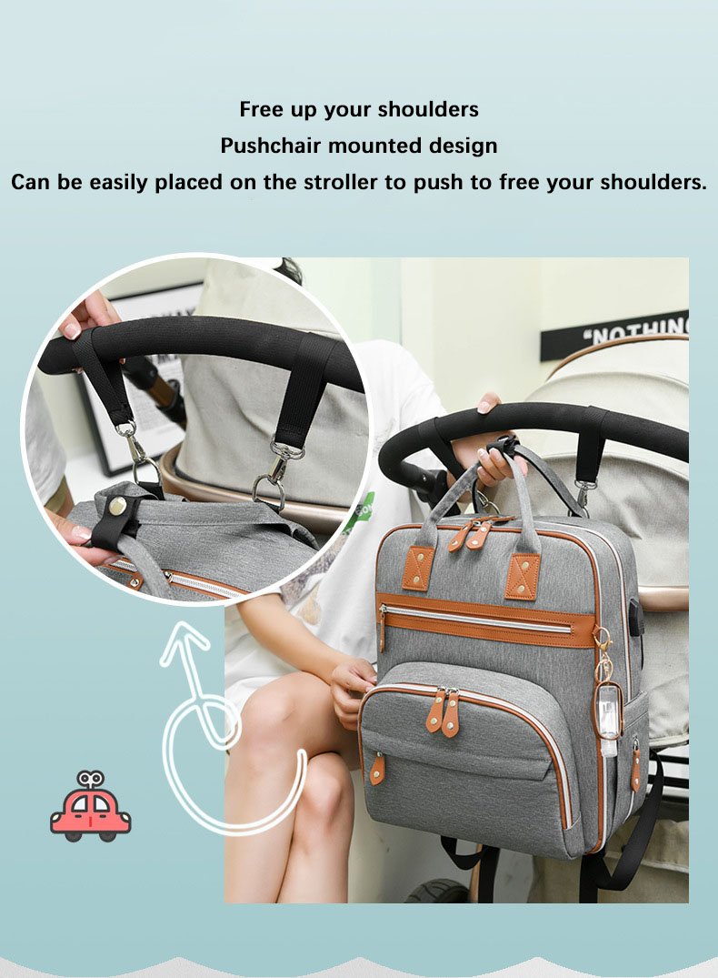 This backpack is the ideal companion for parents, offering a blend of convenience, organization, and fashion for all your baby’s needs on the go.