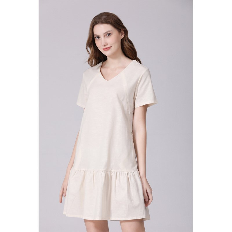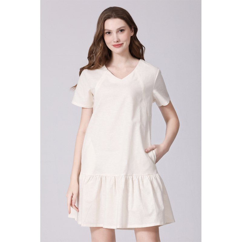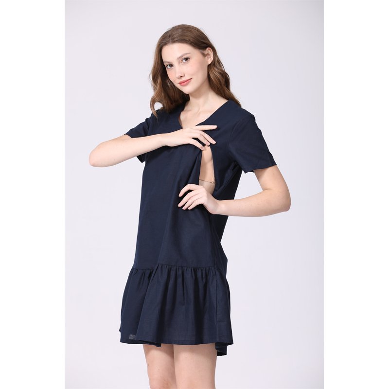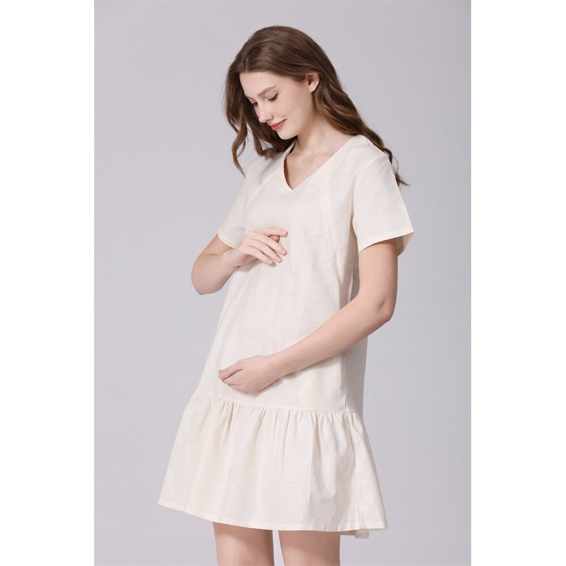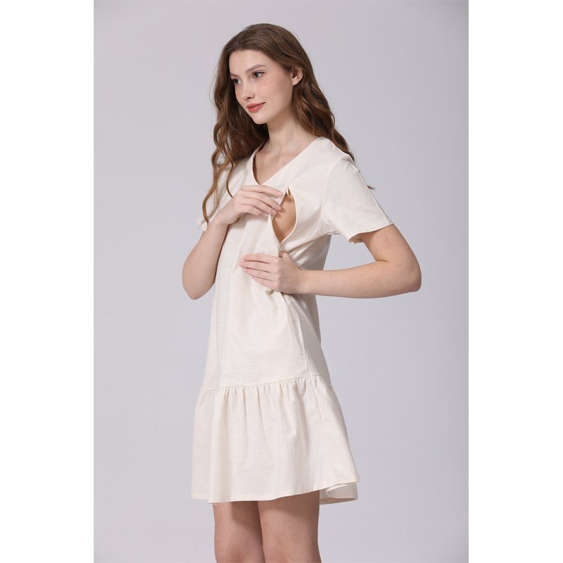 The All-in-One Pregnancy & Breastfeeding Dress combines comfort and practicality for expecting and breastfeeding mothers. Made from 70% cotton and 30% linen, this breathable dress keeps you cool and comfortable all day. Its V-neck design and invisible nursing zipper make breastfeeding easy and discreet, while the knee-length cut and pockets add both style and function.