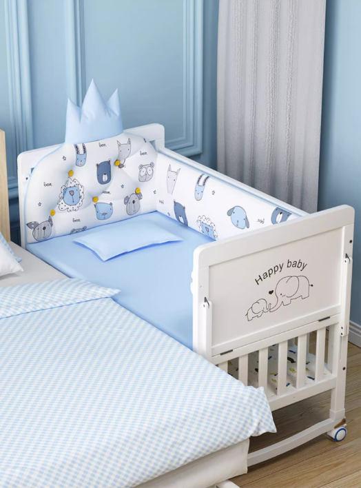 Enhance your baby’s nursery with the Adjustable Bebe Wooden Crib, which combines elegance with practical functionality. Crafted from durable pine wood, this crib offers a blend of modern design and versatile features to ensure a comfortable and safe sleep environment for your little one. With adjustable height settings, an openable side for easy access, ample storage space, and convenient wheels, this crib meets all your needs while maintaining a stylish appearance.